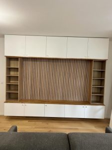 Dans un appartement parisien, nous avons conçu une bibliothèque sur mesure intégrant un meuble TV. Cette solution maximise l’espace tout en offrant un design élégant et pratique, parfaitement intégré à l’environnement.