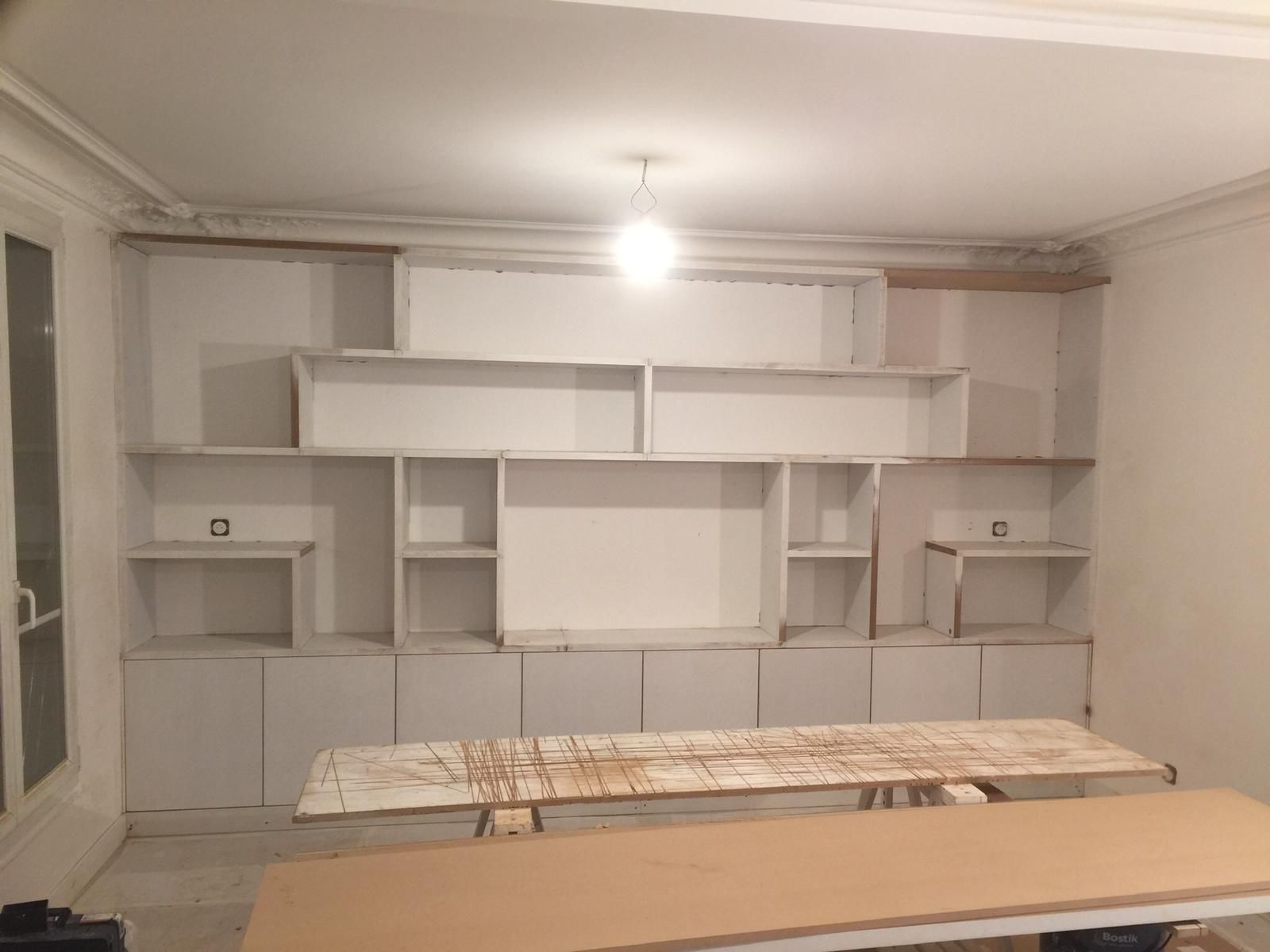 Dans un appartement parisien, nous avons conçu une bibliothèque sur mesure intégrant un meuble TV. Cette solution maximise l’espace tout en offrant un design élégant et pratique, parfaitement intégré à l’environnement.